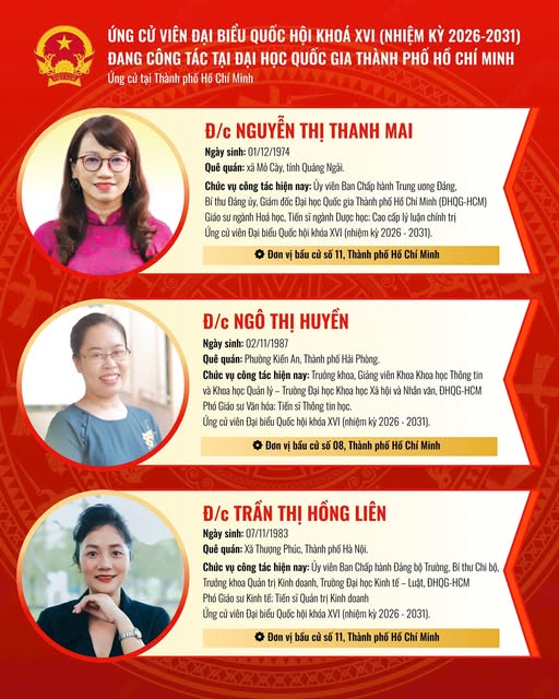 (04/03/2026) 1. GS.TS Nguyễn Thị Thanh Mai - Ủy viên Ban Chấp hành Trung ương Đảng, Bí thư Đảng ủy, Giám đốc Đại học Quốc gia Thành phố Hồ Chí Minh (ĐHQG-HCM) Ứng cử viên Đại biểu Quốc hội khóa XVI tại đơn vị bầu cử số 11, TP. Hồ Chí Minh, gồm các Phường: Đông Hòa, Linh Xuân, Thủ Đức, Tăng Nhơn Phú, Long Bình, Long Phước, Bình Trưng, Phước Long, Long Trường. 2. PGS.TS Ngô Thị Huyền - Trưởng khoa Khoa học thông tin và Khoa học quản lý, Trường ĐH Khoa học xã hội và Nhân văn, ĐHQG-HCM Ứng cử viên Đại biểu Quốc hội Khóa XVI tại Đơn vị bầu cử số 8 TP. Hồ Chí Minh, gồm các Phường: Phú Thạnh, Phú Lâm, An Lạc, Hòa Bình, Phú Thọ, Bình Thới, Minh Phụng, Tân Hòa, Bảy Hiền, Tân Bình, Tân Sơn, Tây Thạnh, Tân Sơn Nhì, Phú Thọ Hòa, Tân Phú. 3. PGS.TS Trần Thị Hồng Liên - Trưởng khoa Khoa Quản trị Kinh doanh, Trường ĐH Kinh tế - Luật, ĐHQG-HCM Ứng cử viên Đại biểu Quốc hội khóa XVI tại đơn vị bầu cử số 11, TP. Hồ Chí Minh, gồm các Phường: Đông Hòa, Linh Xuân, Thủ Đức, Tăng Nhơn Phú, Long Bình, Long Phước, B