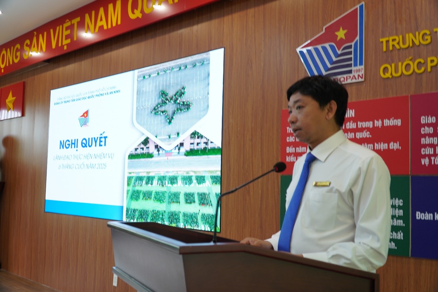 Xác định nhiệm vụ 6 tháng cuối năm 2025, Đảng ủy Trung tâm tập trung lãnh đạo, chỉ đạo hoàn thành tốt các nội dung, nhiệm vụ công tác năm 2025 đã đề ra. Trọng tâm là tổ chức tổng kết 03 năm thực hiện Nghị quyết chuyên đề số của Đảng ủy Trung tâm về đổi mới cơ chế hoạt động của Trung tâm GDQPAN giai đoạn 2023 – 2025; xúc tiến khởi công dự án đầu tư xây dựng Ký túc xá B6 và B7. Tiếp tục đảm bảo thực hiện đúng quy định về công tác tổ chức, cán bộ, đảng viên. Nâng cao chất lượng, hiệu quả công tác nghiên cứu khoa học, đổi mới phương pháp giảng dạy. Tổ chức Hội thi Đại đội trưởng quản lý sinh viên lần thứ nhất; thực hiện đánh giá chuẩn đầu ra môn học GDQPAN và triển khai thực hiện công khai chứng chỉ GDQPAN trên trang thông tin điện tử của Trung tâm. Đầu tư mua sắm, bảo đảm đầy đủ cơ sở vật chất, trang bị, bãi tập đáp ứng tốt cho giảng dạy. Duy trì thực hiện có chất lượng, hiệu quả công tác tiếp nhận, quản lý, giáo dục, rèn luyện 100% sinh viên theo nền nếp quân sự; đa dạng các hình thức hoạt động ngoại khóa và chăm lo sức khoẻ cho sinh viên.