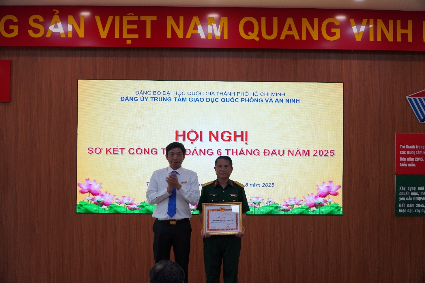 Chiều 01/8, Đảng ủy Trung tâm Giáo dục Quốc phòng và An ninh (GDQPAN), Đại học Quốc gia Thành phố Hồ Chí Minh (ĐHQG-HCM) tổ chức Hội nghị Sơ kết công tác Đảng 6 tháng đầu năm 2025. Đến tham dự có đồng chí Lê Thanh Hải, Ủy viên Ban Chấp hành Đảng bộ ĐHQG-HCM; đồng chí Nguyễn Thị Mai Trang, Phó Chánh Văn phòng Đảng ủy ĐHQG-HCM; đại diện Phòng Kế hoạch – Tổng hợp, Phòng Cán bộ/Cục Chính trị Quân khu 7; đại diện Cơ quan Ủy ban Kiểm tra Đảng ủy, Ban Tuyên giáo Đảng ủy ĐHQG-HCM và toàn thể đảng viên trong Đảng bộ Trung tâm GDQPAN. Đồng chí Đỗ Đại Thắng, Bí thư Đảng ủy chủ trì Hội nghị.