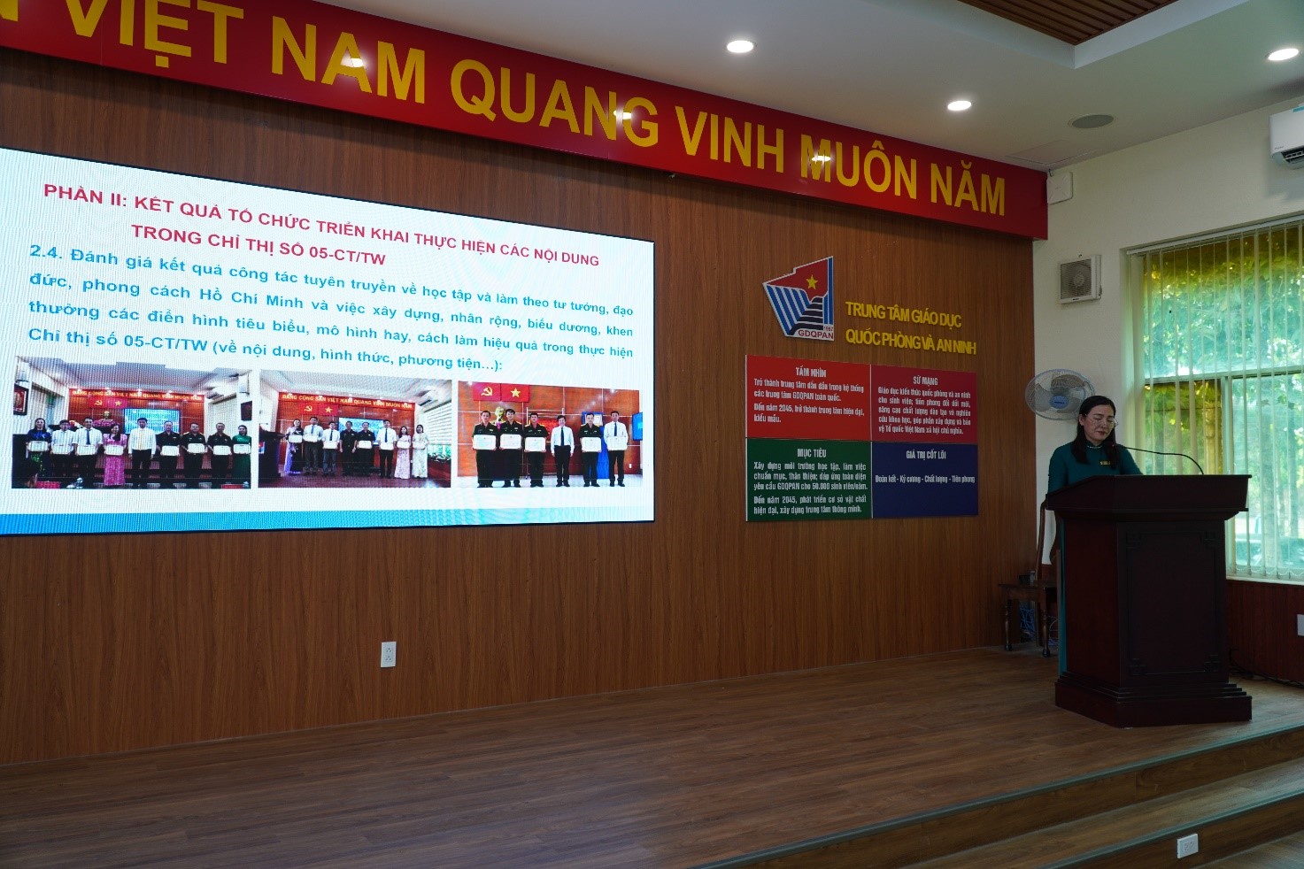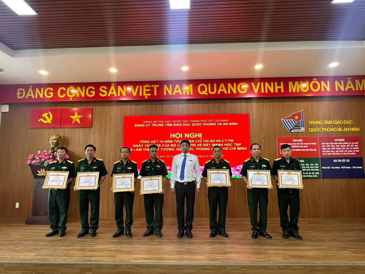 Chiều 01/8, Đảng ủy Trung tâm Giáo dục Quốc phòng và An ninh (GDQPAN), Đại học Quốc gia Thành phố Hồ Chí Minh (ĐHQG-HCM) tổ chức Hội nghị Tổng kết 10 năm thực hiện Chỉ thị số 05-CT/TW ngày 15/5/2016 của Bộ Chính trị về đẩy mạnh học tập và làm theo tư tưởng, đạo đức, phong cách Hồ Chí Minh. Đến tham dự có sự hiện diện của toàn thể đảng viên trong Đảng bộ Trung tâm GDQPAN. Đồng chí Đỗ Đại Thắng, Bí thư Đảng ủy chủ trì Hội nghị.