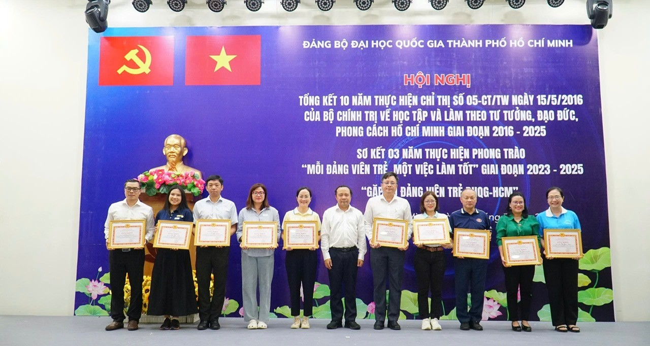 Đồng chí Vũ Hải Quân, Ủy viên Ban Chấp hành Trung ương Đảng, Bí thư Đảng ủy, Giám đốc ĐHQG-HCM, tặng Giấy khen của Ban Thường vụ Đảng ủy ĐHQG-HCM đối với các cá nhân có thành tích xuất sắc qua 10 năm thực hiện Chỉ thị số 05-CT/TW