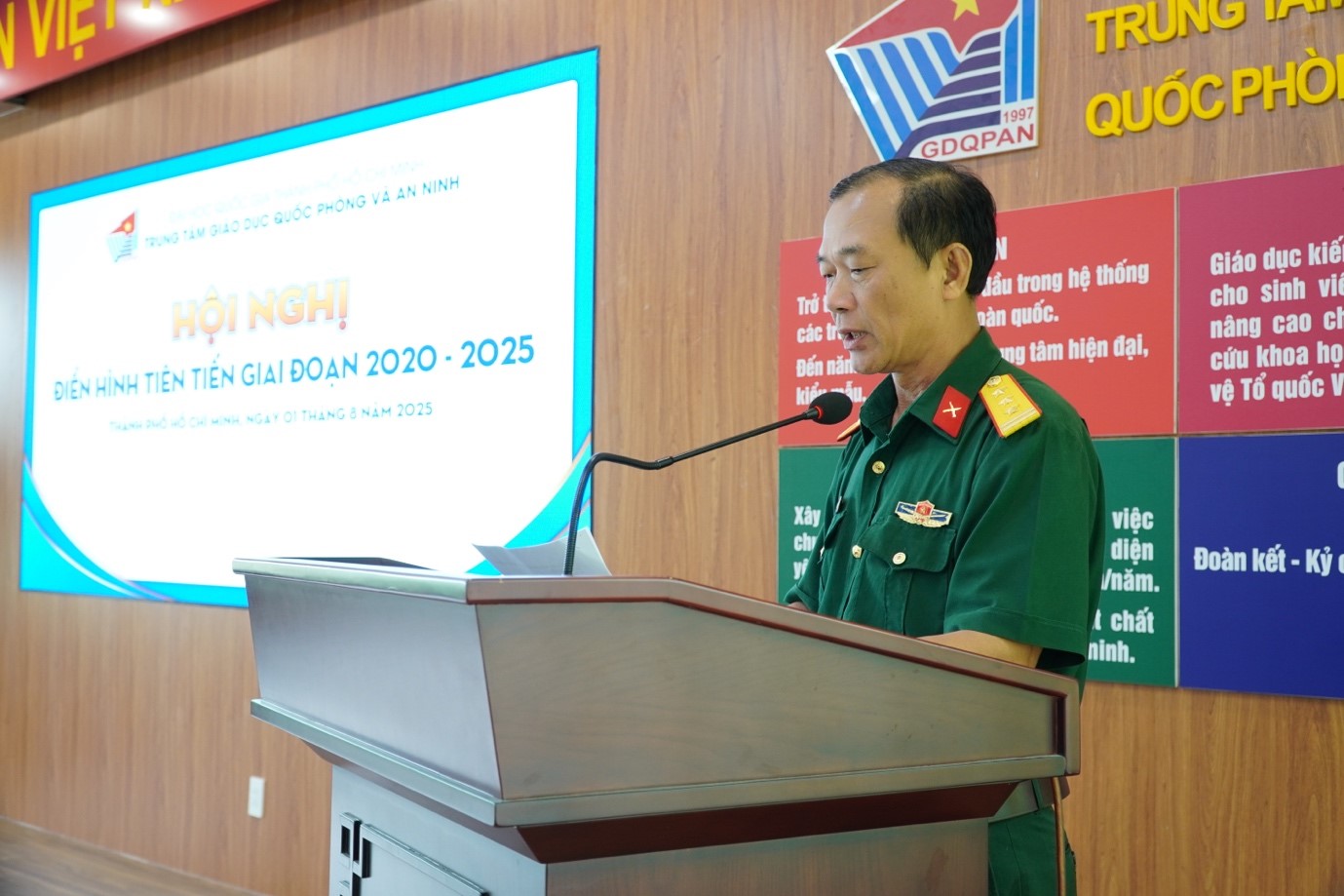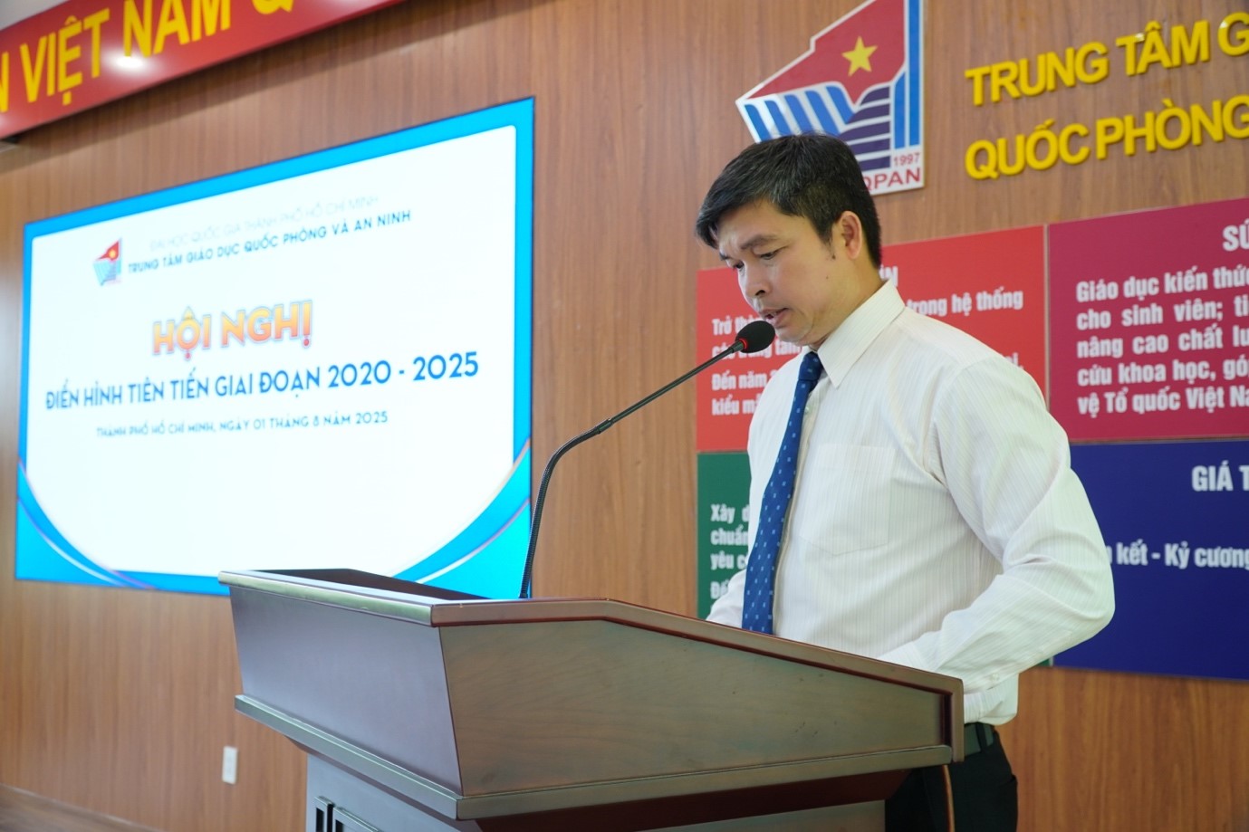 Chiều 01/8, Trung tâm Giáo dục Quốc phòng và An ninh (GDQPAN), Đại học Quốc gia Thành phố Hồ Chí Minh (ĐHQG-HCM) đã tổ chức thành công Hội nghị điển hình tiên tiến giai đoạn 2020 - 2025. Hội nghị được tổ chức nhằm tăng cường công tác tuyên truyền về tư tưởng thi đua yêu nước của Chủ tịch Hồ Chí Minh, các chủ trương, đường lối của Đảng, chính sách, pháp luật của Nhà nước về công tác thi đua khen thưởng. Đồng thời, giới thiệu và lan tỏa các gương điển hình tiên tiến trên các lĩnh vực công tác quản lý, giảng dạy, nghiên cứu khoa học và phục vụ cộng đồng tại Trung tâm. TRUNG TÂM GDQPAN, ĐHQG-HCM TỔ CHỨC THÀNH CÔNG HỘI NGHỊ ĐIỂN HÌNH TIÊN TIẾN GIAI ĐOẠN 2020 – 2025Tham dự Hội nghị về phía Trung tâm GDQPAN, ĐHQG-HCM có Tiến sĩ Đỗ Đại Thắng - Bí thư Đảng ủy, Giám đốc Trung tâm; Thạc sĩ Trần Văn Giao, Phó Giám đốc Trung tâm;  Đại tá Nguyễn Trọng Lý, Phó Giám đốc Trung tâm;  Đại tá Lưu Văn Điện, Phó Giám đốc Trung tâm. Về phía ĐHQG-HCM có sự tham dự của Thạc sĩ Huỳnh Thị Hải Quyên, Phó Trưởng ban Ban Tổ chức - Cán bộ ĐHQG-HCM.