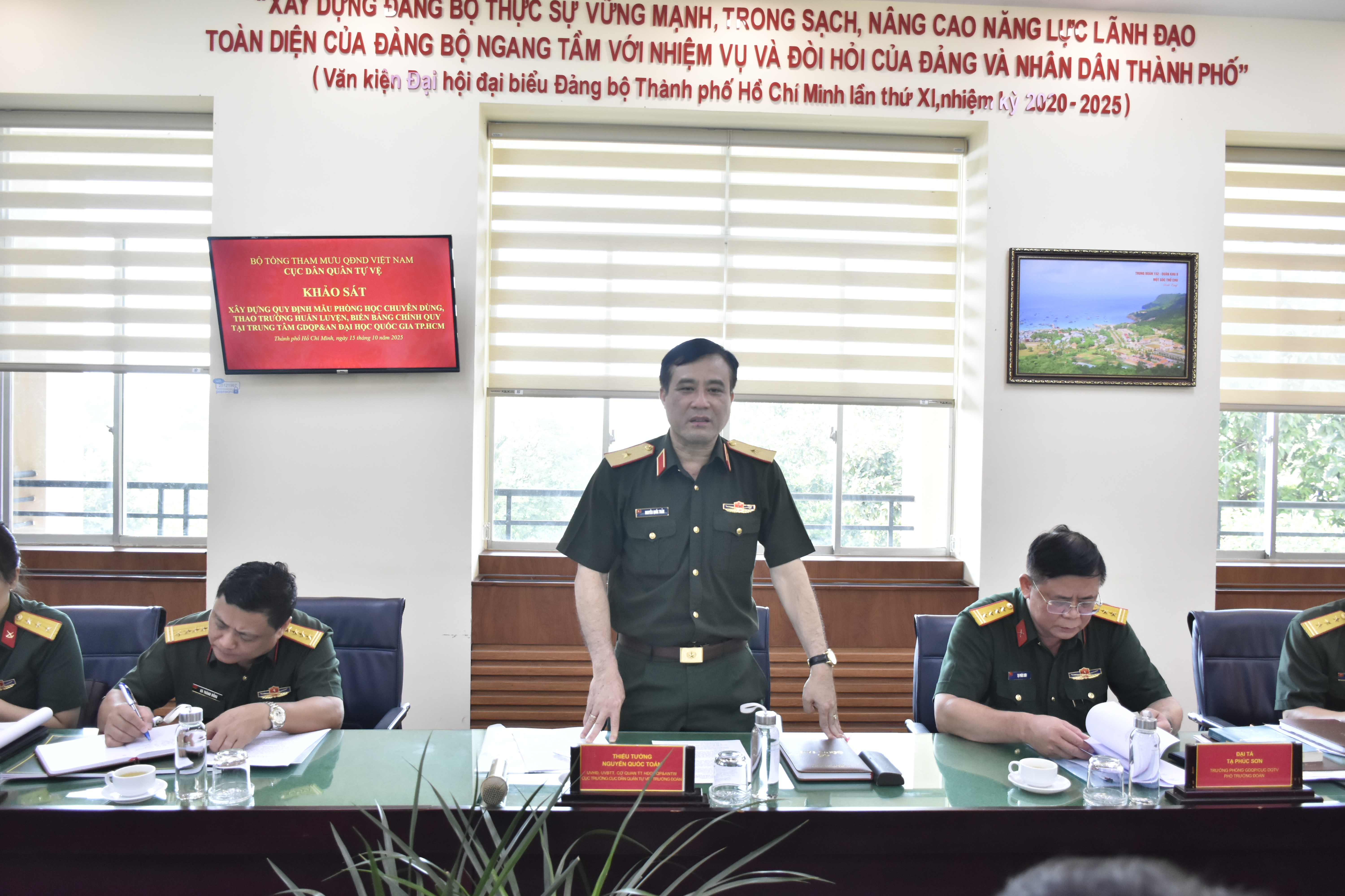 Thay mặt Đoàn công tác, Thiếu tướng Nguyễn Quốc Toản ghi nhận và đánh giá cao những nỗ lực, kết quả mà Trung tâm GDQPAN, ĐHQG-HCM đã đạt được trong công tác tổ chức, giảng dạy, rèn luyện và quản lý sinh viên. Kết quả của đợt khảo sát lần này sẽ là cơ sở quan trọng để xây dựng quy định chuẩn về phòng học chuyên dùng, thao trường huấn luyện chiến thuật, khu sinh hoạt tập trung và hệ thống biển bảng chính quy; báo cáo Thủ trưởng Bộ Tổng Tham mưu, Bộ Quốc phòng Ban hành Quy định triển khai, thực hiện thống nhất trên phạm vi toàn quốc.