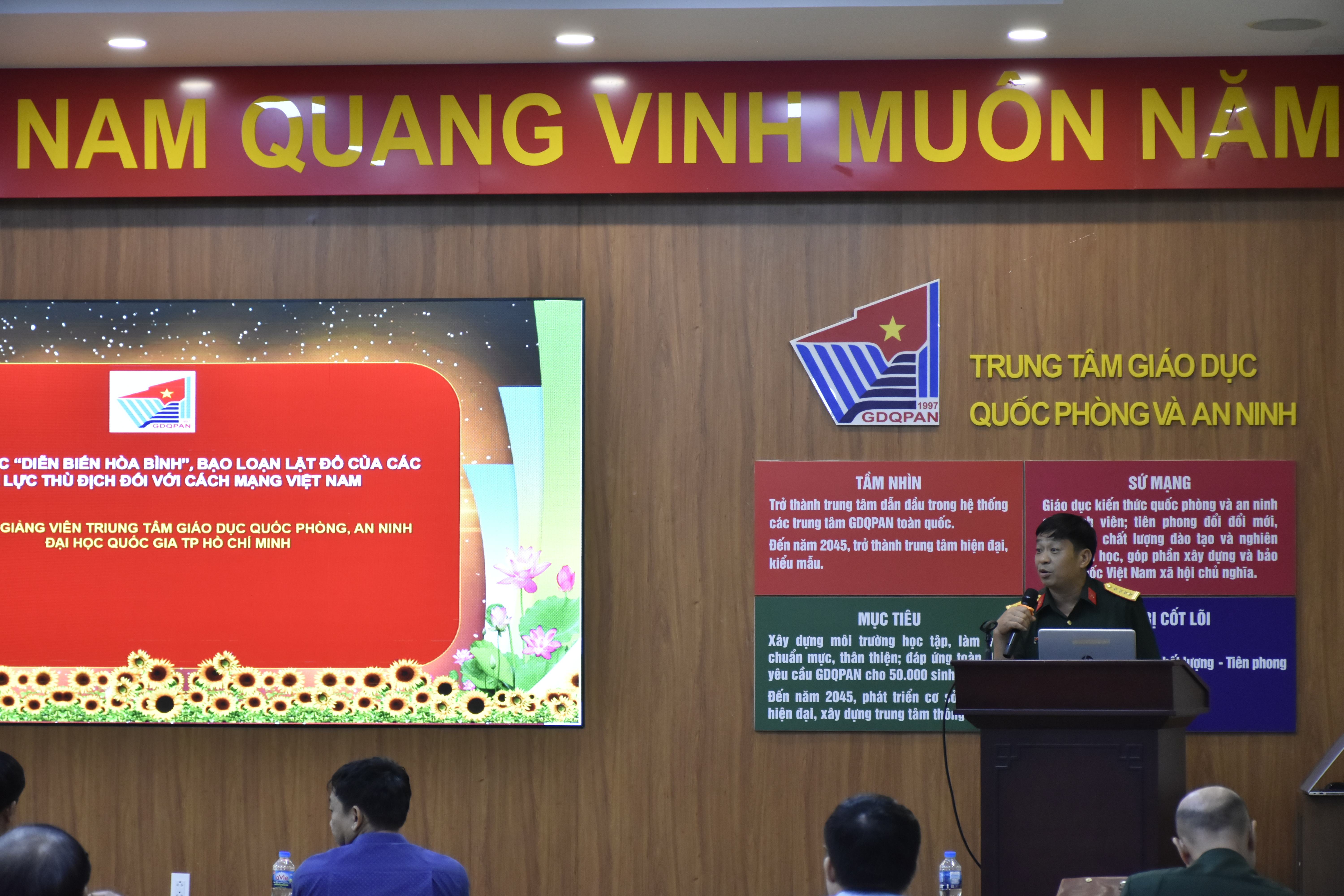 Sau khi Bộ GD&ĐT tổ chức tập huấn cán bộ quản lý, giáo viên, giảng viên GDQPAN lồng ghép nội dung GDQPAN trong trường tiểu học, trung học cơ sở năm 2025 được tổ chức từ ngày 21 - 24/7/2025 tại Cần Thơ, để kịp thời cập nhật những kiến thức mới và nâng cao năng lực chuyên môn cho đội ngũ giảng viên, Trung tâm Giáo dục Quốc phòng và An ninh (GDQPAN), Đại học Quốc gia Thành phố Hồ Chí Minh (ĐHQG-HCM) vừa tổ chức thành công tập huấn giảng viên năm 2025 vào ngày 20/8/2025. Đây là hoạt động thiết thực, thể hiện sự chủ động của Trung tâm trong việc cập nhật bổ sung kiến thức, nâng cao chất lượng đào tạo, đáp ứng yêu cầu ngày càng cao của chương trình giảng dạy GDQPAN, giúp các giảng viên củng cố kiến thức, trau dồi kỹ năng sư phạm, từ đó nâng cao hiệu quả công tác giảng dạy.