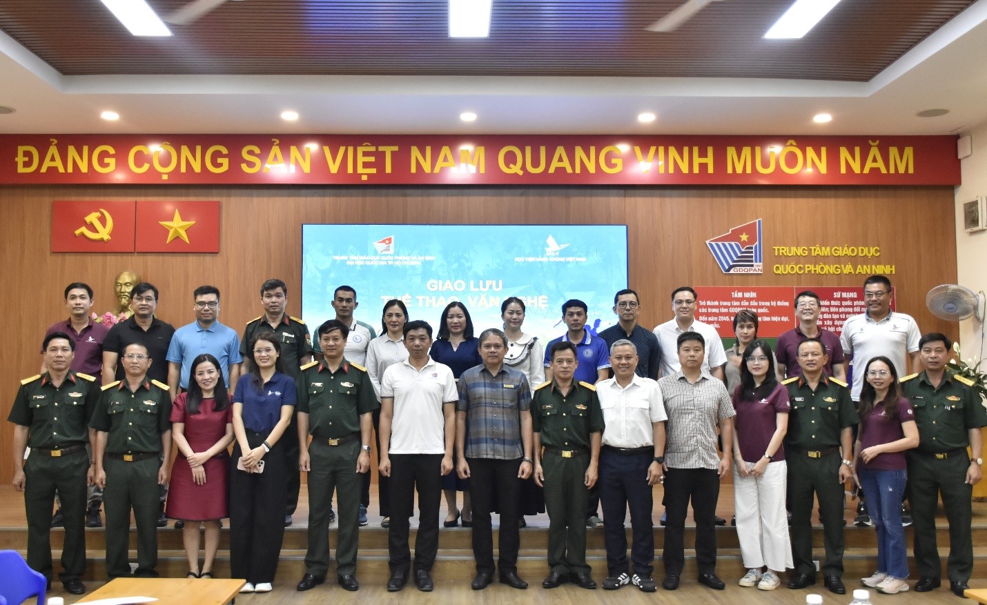 Chiều ngày 06/01, tại Trung tâm Giáo dục Quốc phòng và An ninh (GDQPAN), Đại học Quốc gia Thành phố Hồ Chí Minh (ĐHQG-HCM) đã diễn ra chương trình giao lưu thể thao – văn nghệ giữa Trung tâm và Học viện Hàng không Việt Nam (HVHKVN). Hoạt động nhằm tạo không gian gặp gỡ, kết nối, góp phần tăng cường sự phối hợp và gắn bó giữa hai đơn vị trong quá trình tổ chức giảng dạy, quản lý sinh viên học tập GDQPAN tại Trung tâm.CHƯƠNG TRÌNH GIAO LƯU THỂ THAO – VĂN NGHỆ GIỮA TRUNG TÂM GDQPAN, ĐHQG-HCM VÀ HỌC VIỆN HÀNG KHÔNG VIỆT NAM