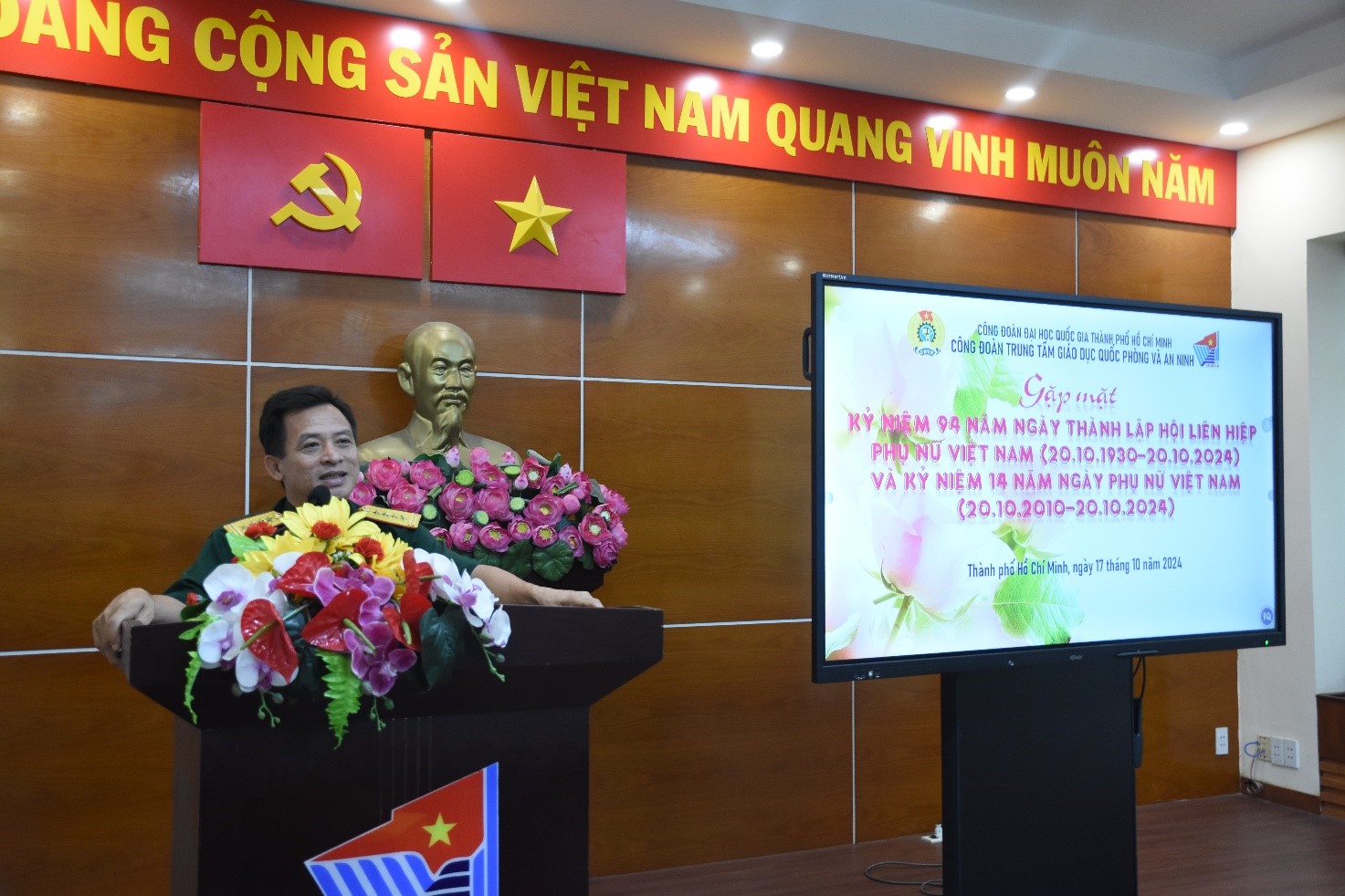 Chiều 17/10, Công đoàn Trung tâm Giáo dục Quốc phòng và An ninh (GDQPAN), Đại học Quốc gia Thành phố Hồ Chí Minh (ĐHQG-HCM) tổ chức Gặp mặt kỷ niệm 94 năm Ngày thành lập Hội Liên hiệp Phụ nữ Việt Nam (20/10/1930 – 20/10/2024) và kỷ niệm 14 năm Ngày Phụ nữ Việt Nam (20/10/2010 – 20/10/2024). Tham dự có Tiến sĩ Đỗ Đại Thắng, Bí thư Đảng ủy, Giám đốc Trung tâm; Thạc sĩ Trần Văn Giao, Phó Bí thư Đảng ủy, Phó Giám đốc Trung tâm; các đồng chí trong Đảng ủy, Ban Giám đốc Trung tâm, thủ trưởng phòng, khoa; Ban Chấp hành Công đoàn Trung tâm và toàn thể Nữ đoàn viên công đoàn.