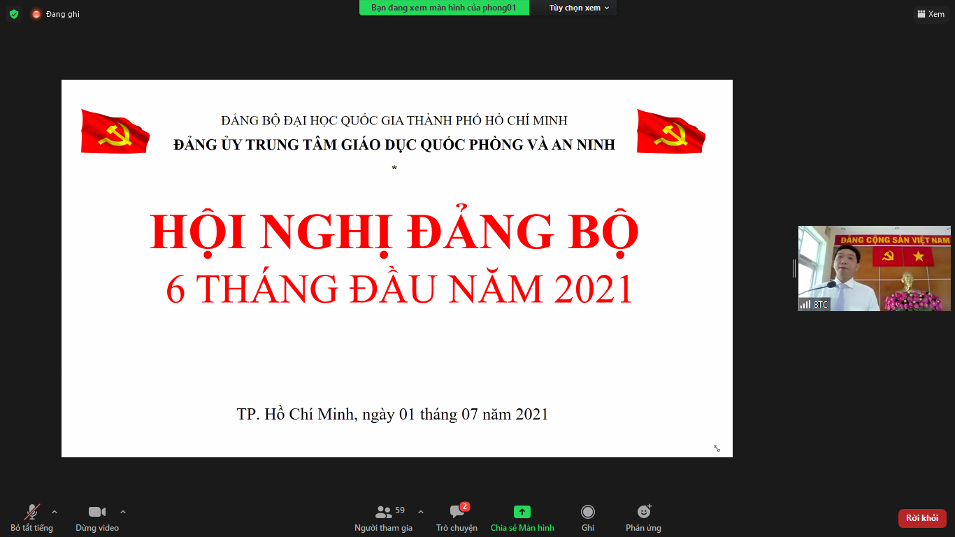 Sáng ngày 01/7/2021, Đảng ủy Trung tâm GDQPAN, ĐHQG-HCM tổ chức Hội nghị Đảng Bộ trực tuyến nhằm dánh giá việc thực hiện Nghị quyết lãnh đạo 6 tháng đầu năm 2021, rút ra những bài học kinh nghiệm trong công tác lãnh đạo, chỉ đạo, triển khai thực hiện Nghị quyết; từ đó, đề ra phương hướng lãnh đạo thực hiện Nghị quyết 6 tháng cuối năm 2021.