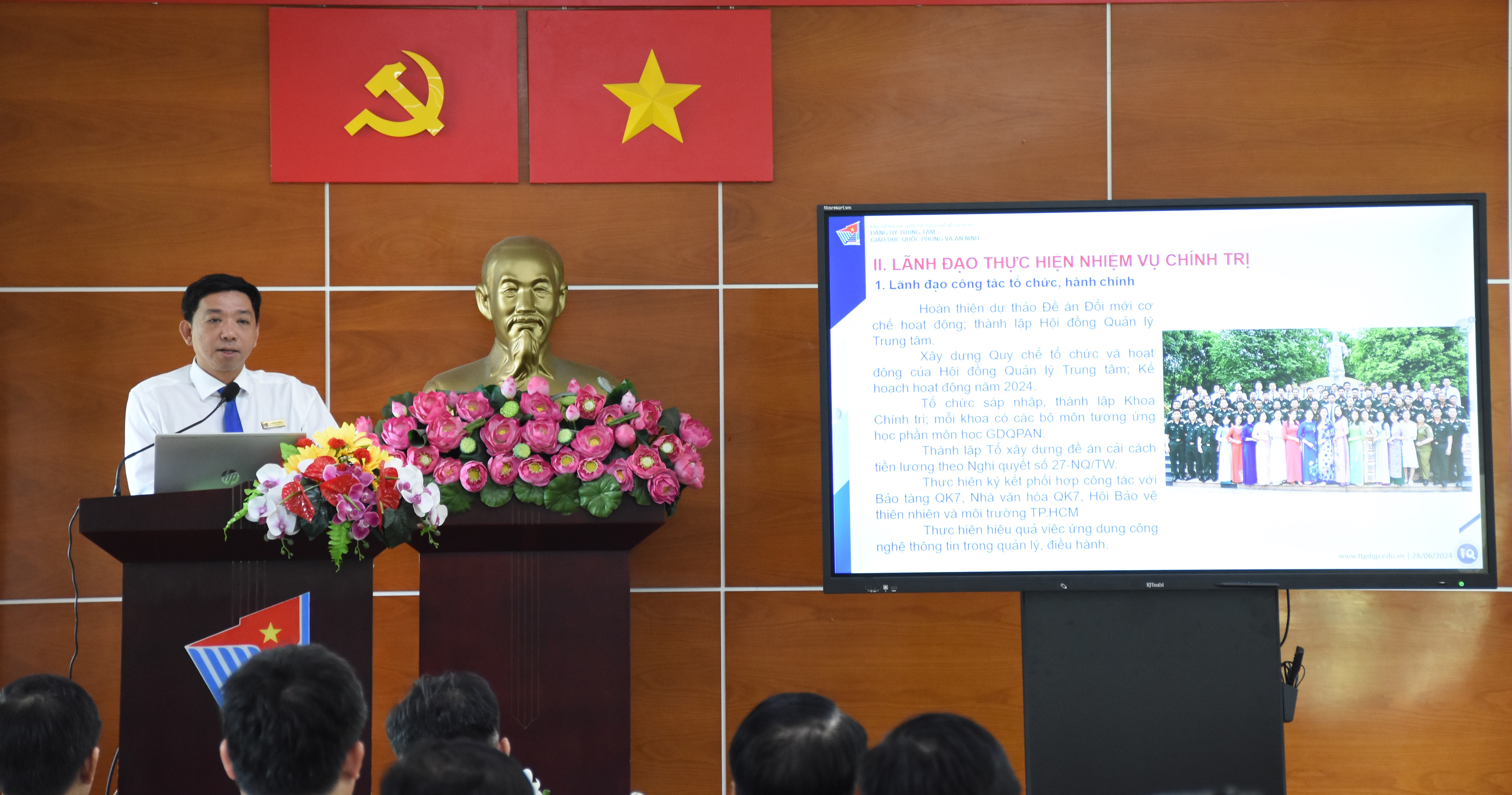 Trong 6 tháng đầu năm 2024, Đảng ủy Trung tâm đã lãnh đạo tổ chức tốt công tác GDQPAN cho 19.252 sinh viên của 04 trường đại học và 01 trường cao đẳng. Chất lượng giảng dạy được nâng lên, cơ sở vật chất cơ bản đáp ứng yêu cầu nhiệm vụ. Phối hợp với Trường Đại học Sư phạm Thành phố Hồ Chí Minh tổ chức thành công Hội thảo khoa học quốc gia “70 năm chiến thắng Điện Biên Phủ - Giá trị lịch sử và bài học cho công tác GDQPAN hiện nay”. Trung tâm tổ chức Hội nghị Liên kết GDQPAN năm học 2024-2025, qua đó thống nhất kế hoạch GDQPAN với các trường liên kết năm học 2024-2025 bảo đảm phù hợp thực tế của Trung tâm, ăn ở rèn luyện tập trung theo nếp sống Quân đội bảo đảm chặt chẽ, hiệu quả, kỷ luật, an toàn tuyệt đối. Tăng cường đẩy mạnh ứng dụng công nghệ thông tin vào việc tiếp nhận, biên chế sinh viên; quản lý, rèn luyện sinh viên và cấp phát quân trang. Tổ chức, phát động các phong trào thi đua, nhiều hoạt động ngoại khóa, giáo dục kỹ năng sống, kỹ năng thực hành xã hội thiết thực, ý nghĩa đối với sinh viên. Công tác hậu cần, tài chính, kỹ thuật đáp ứng tốt cho yêu cầu nhiệm vụ thường xuyên, đảm bảo phục vụ công tác quản lý, điều hành đơn vị, công tác giảng dạy, học tập và sinh hoạt của sinh viên.