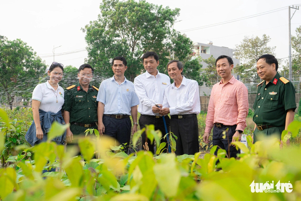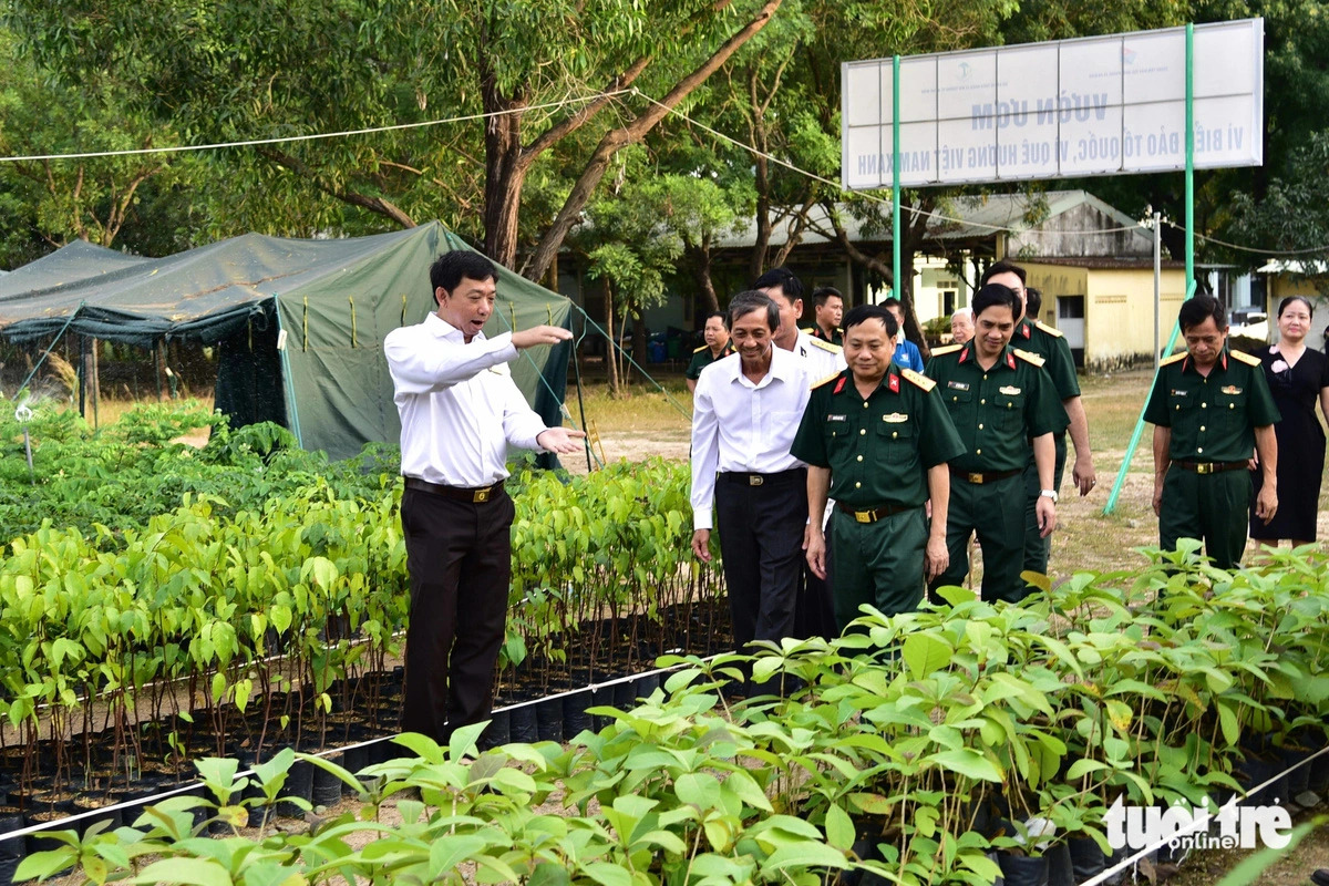 TS Đỗ Đại Thắng (bìa phải), giám đốc Trung tâm giáo dục quốc phòng và an ninh, Đại học Quốc gia TP.HCM, cùng đại diện các đơn vị liên quan tham quan vườn ươm - Ảnh: TRÍ ĐỨC