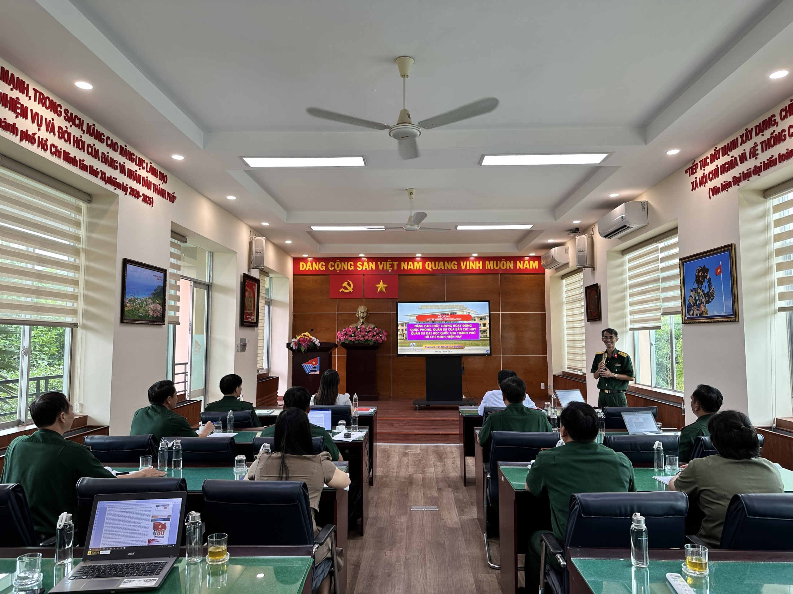 Buổi chiều ngày 19/7/2024 (Thứ 6), Hội đồng đã thông qua 04 đề cương đề tài nghiên cứu khoa học: xây dựng môi trường văn hóa tại Trung tâm GDQPAN ĐHQG-HCM do Thượng tá Nguyễn Đức Hiệp làm chủ nhiệm đề tài; Ảnh hưởng của mạng xã hội đối với sinh viên khi học GDQPAN tại Trung tâm GDQPAN ĐHQG-HCM do Thượng tá Trương Xuân Vương làm chủ nhiệm đề tài; nâng cao năng lực tự học môn GDQPAN cho sinh viên tại Trung tâm GDQPAN, ĐHQG-HCM do Thượng tá Nguyễn Duy Phúc làm chủ nhiệm đề tài; nâng cao chất lượng hoạt động công tác quốc phòng, quân sự của Ban Chỉ huy Quân sự Đại học Quốc gia Thành phố Hồ Chí Minh do Thượng tá Phạm Văn Dương làm chủ nhiệm đề tài.