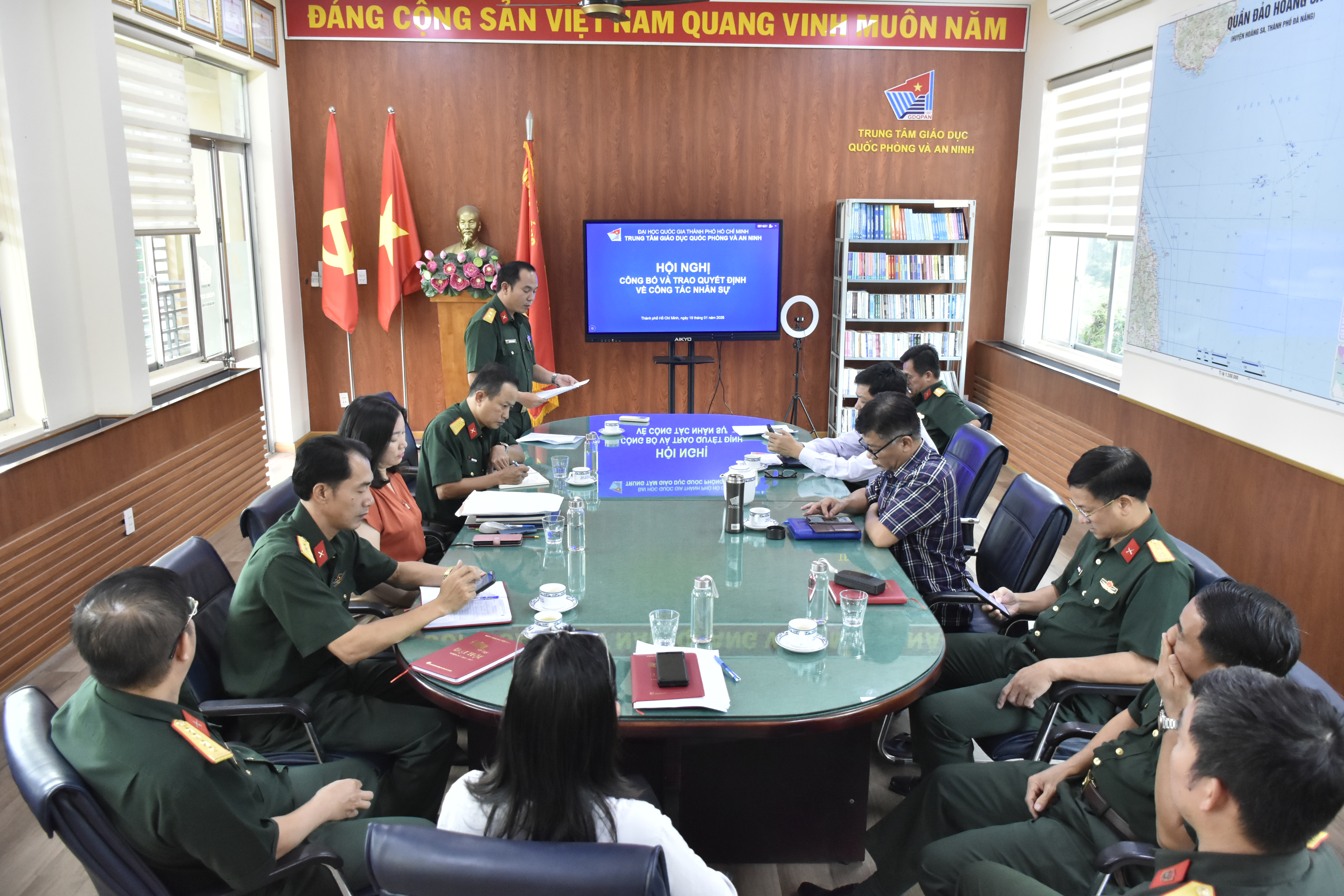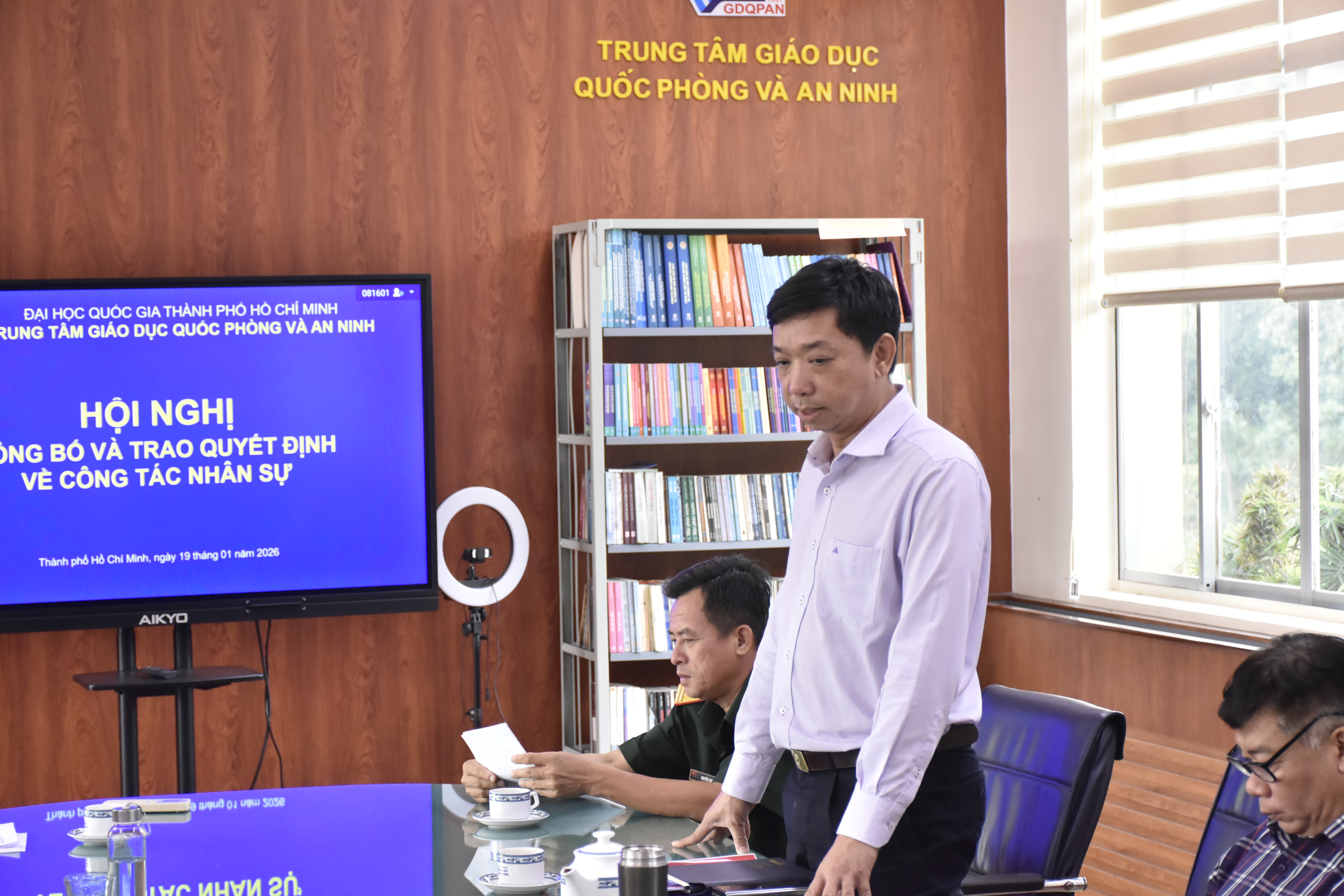 Chiều ngày 19/01/2025, tại phòng họp Hoàng Sa, Trung tâm Giáo dục Quốc phòng và An ninh (GDQPAN), Đại học Quốc gia Thành phố Hồ Chí Minh (ĐHQG-HCM) đã tổ chức Hội nghị công bố và trao quyết định về công tác nhân sự đối với ba đồng chí giữ chức vụ lãnh đạo, quản lý tại Trung tâm.