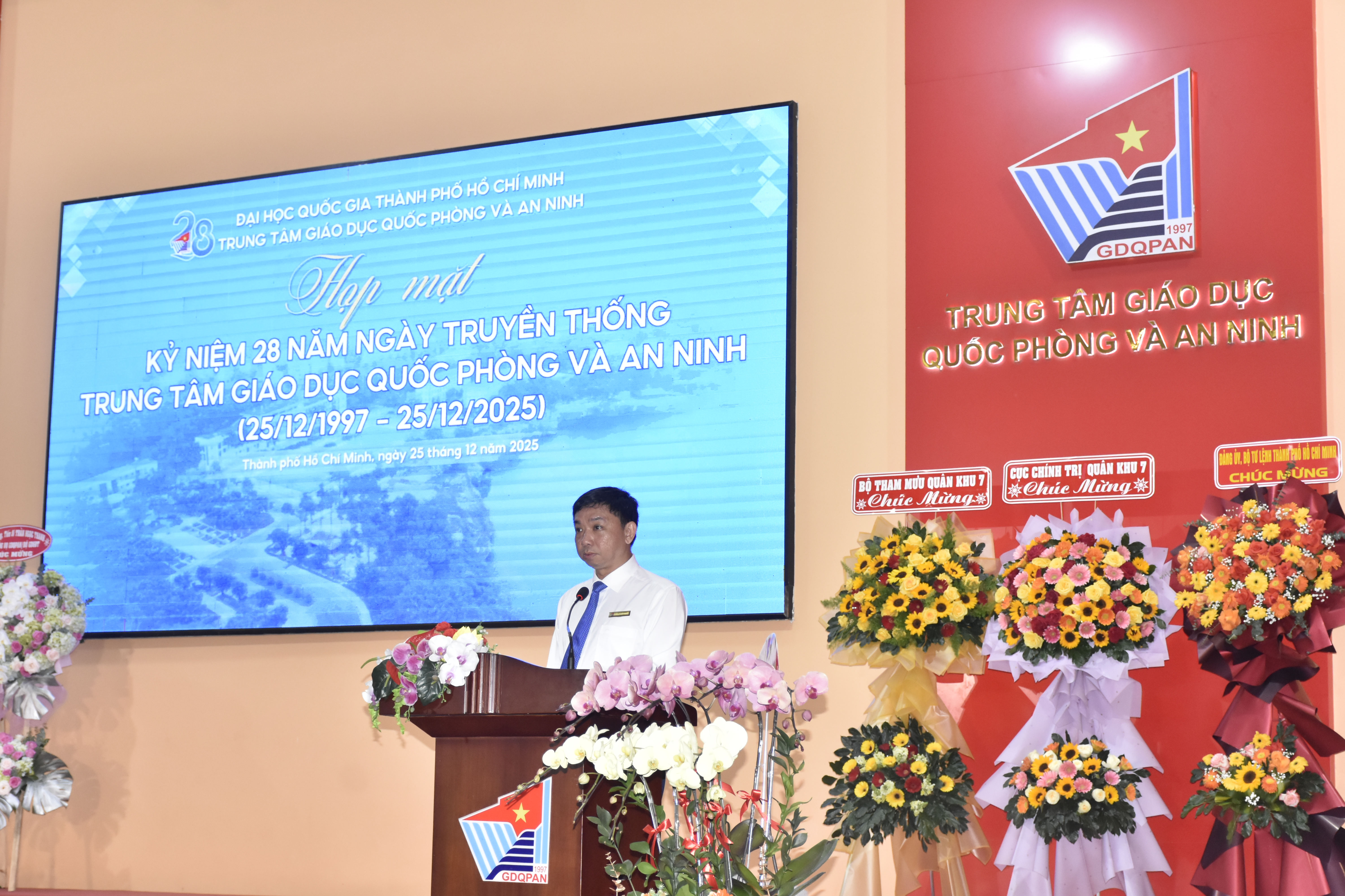 TS. Đỗ Đại Thắng, Bí thư Đảng ủy, Giám đốc Trung tâm phát biểu chào mừngTRUNG TÂM GIÁO DỤC QUỐC PHÒNG VÀ AN NINH, ĐHQG-HCM TỔ CHỨC HỌP MẶT KỶ NIỆM 28 NĂM NGÀY TRUYỀN THỐNG (25/12/1997 – 25/12/2025) Thượng tá Nguyễn Công Toản, Nguyên Bí thư Đảng ủy Trung tâm, Nguyên Trưởng Khoa Chính trị  TRUNG TÂM GIÁO DỤC QUỐC PHÒNG VÀ AN NINH, ĐHQG-HCM TỔ CHỨC HỌP MẶT KỶ NIỆM 28 NĂM NGÀY TRUYỀN THỐNG (25/12/1997 – 25/12/2025)