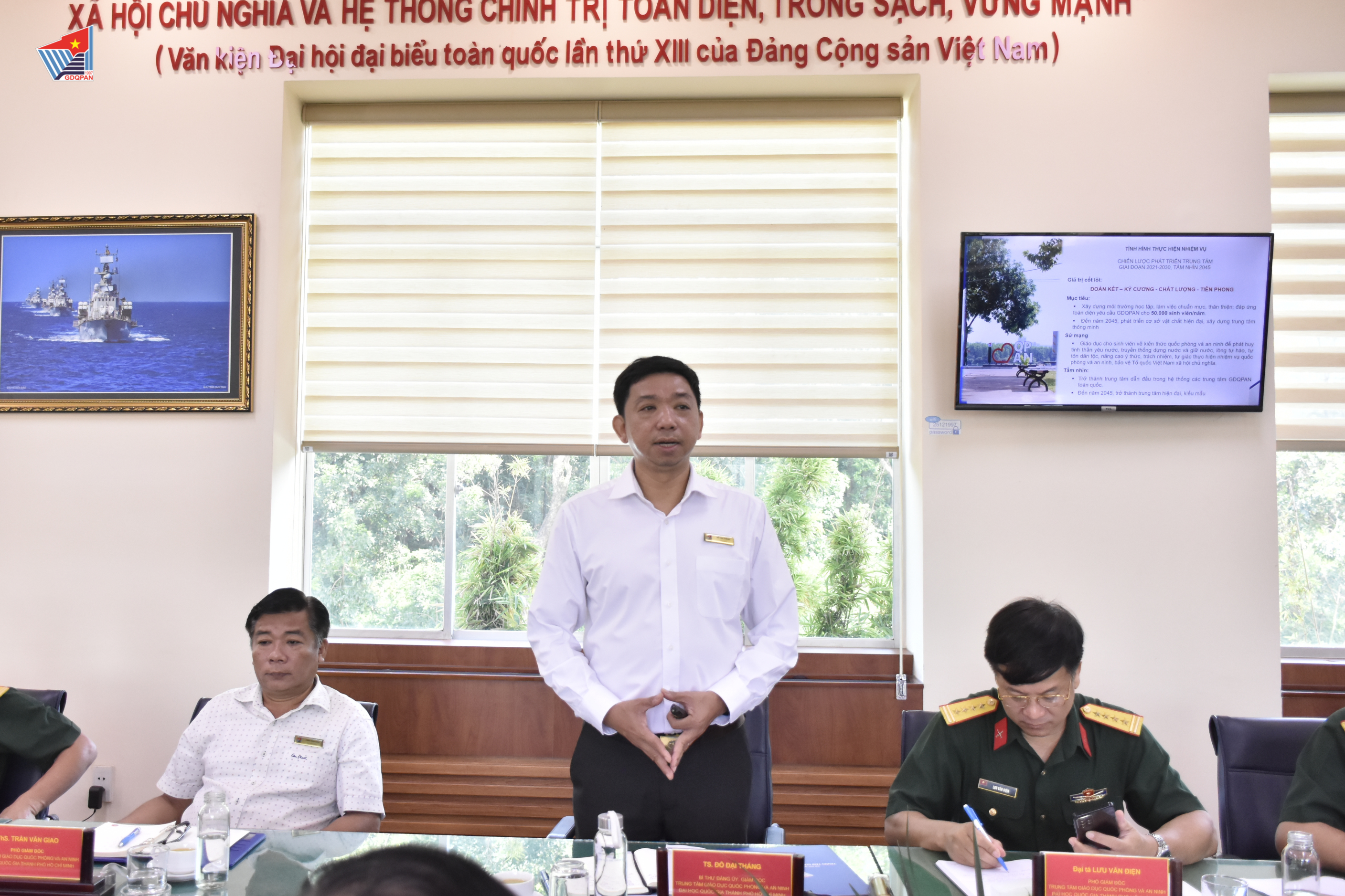 Tại buổi làm việc, Tiến sĩ Đỗ Đại Thắng phát biểu chào mừng Đoàn công tác đến tham quan và khảo sát xây dựng quy định mẫu phòng học chuyên dùng, thao trường huấn luyện, biển bảng chính quy tại Trung tâm. Đồng thời, báo cáo tóm tắt tình hình hoạt động; thực trạng các điều kiện về cơ sở vật chất, kỹ thuật, đội ngũ cán bộ, giảng viên, viên chức và người lao động. Hướng dẫn các thành viên trong Đoàn công tác tham quan, khảo sát thực tế các phòng học chuyên dụng, phòng thi trắc nghiệm trên phần mềm máy tính; kho quân trang, kho vũ khí, trang thiết bị, các bãi tập, thao trường chiến thuật, nơi trưng bày mô hình phục vụ giảng dạy, học tập; các khu vực nhà ăn, dãy nhà lưu trú của sinh viên tại Trung tâm.