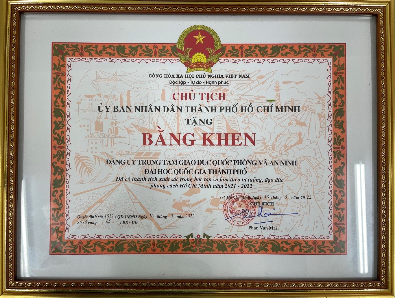 Nhân dịp kỷ niệm 132 năm Ngày sinh của Chủ tịch Hồ Chí Minh (19/5/1890 - 19/5/2022), 111 năm Ngày Bác Hồ ra đi tìm đường cứu nước (05/6/1911 - 05/6/2022), chiều ngày 18/5/2022, Thành ủy Thành phố Hồ Chí Minh đã tổ chức Lễ biểu dương tập thể, cá nhân có thành tích xuất sắc trong học tập và làm theo tư tưởng, đạo đức, phong cách Hồ Chí Minh 2021-2022. Đảng ủy Trung tâm Giáo dục Quốc phòng và An ninh vinh dự được nhận Bằng khen của Chủ tịch Ủy ban nhân dân Thành phố Hồ Chí Minh vì đã có thành tích xuất sắc trong học tập và làm theo tư tưởng, đạo đức, phong cách Hồ Chí Minh năm 2021 - 2022.